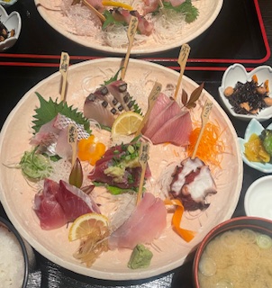 12時 海鮮の昼食 (お刺身・お鮨・鯨料理などお決まりでしたらご予約しておきます)